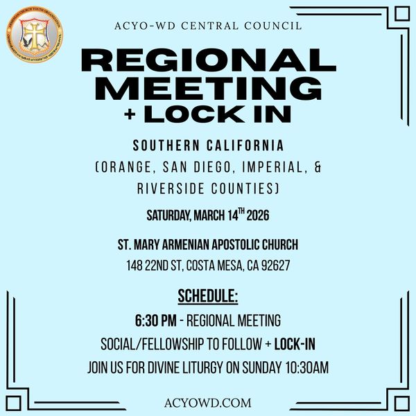 Join us March 14th @ 6:30PM for our Southern California Regional Meeting at St. Mary Armenian Apostolic Church in Costa Mesa! We will enjoy some fellowship time after the meeting as well as a Lock In!!! Come join us to grow our ACYO mission together and a great time with friends and family. Join us the next day as well for Badarak service at 10:30 am. RSVP today and reserve your spot for this regional meeting