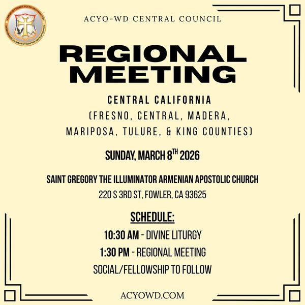 Join us March 8th @ 1:30PM for our Central California Regional Meeting at Saint Gregory the Illuminator Armenian Apostolic Church in Fowler! We will start the morning will Badarak service and we will enjoy some fellowship time after the meeting as well. Come join us to grow our ACYO mission together and a great time with friends and family.