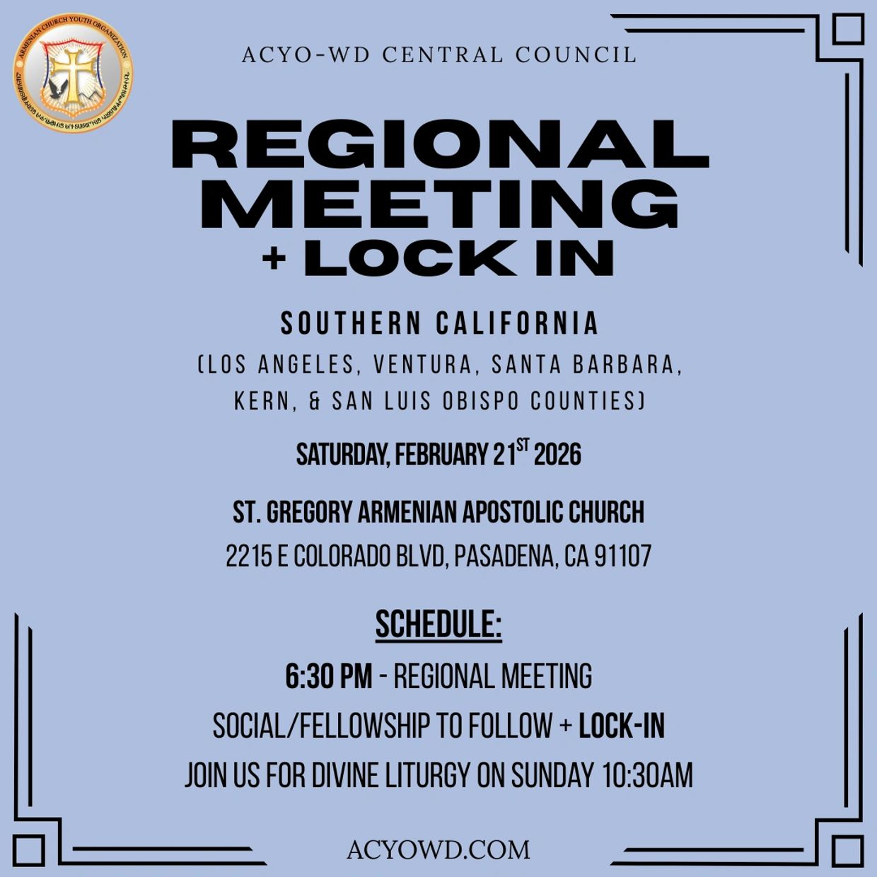 Join us February 21st @ 6:30PM for our Southern California Regional Meeting at St Gregory Armenian Apostolic Church in Pasadena! We will enjoy some fellowship time after the meeting as well as a Lock In!!! Come join us to grow our ACYO mission together and a great time with friends. RSVP today and reserve your spot for this regional meeting