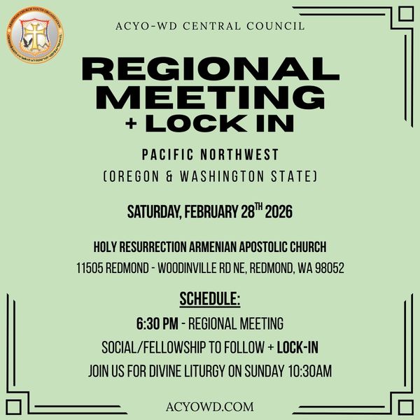 Join us February 28th @ 6:30PM for our Pacific Northwest Regional Meeting at Holy Resurrection Armenian Apostolic Church in Seattle! We will enjoy some fellowship time after the meeting as well as a Lock In!!! Come join us to grow our ACYO mission together and a great time with friends and family. Join us for Badarak service the next morning. RSVP today and reserve your spot for an action packed weekend